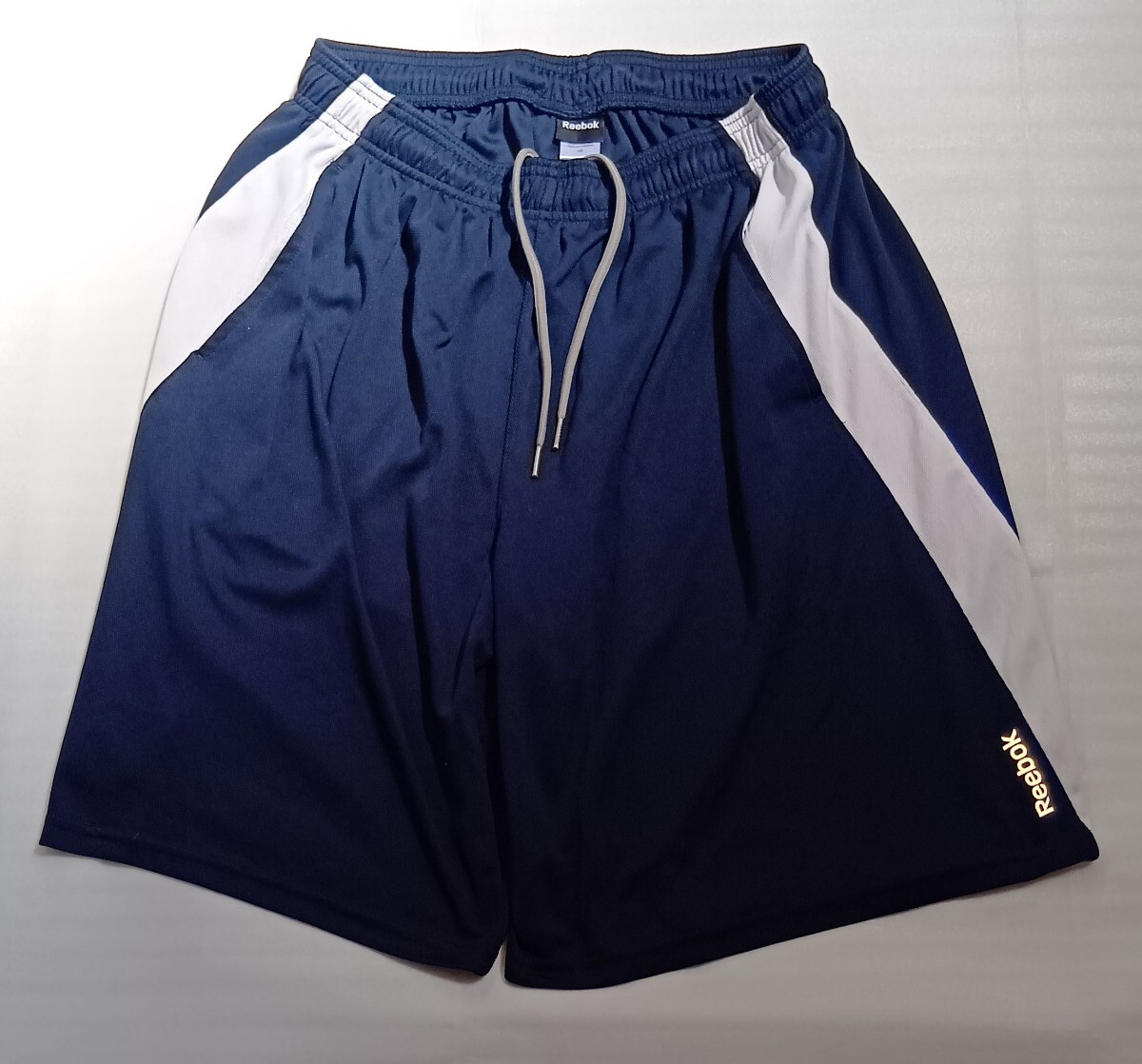> ☆Reebok.COM サイズL ショート短パンツ半ハーフ紺色ネイビー白ストレッチLINEズボン ボトムス スポーツ ファッション ブランド リーボック