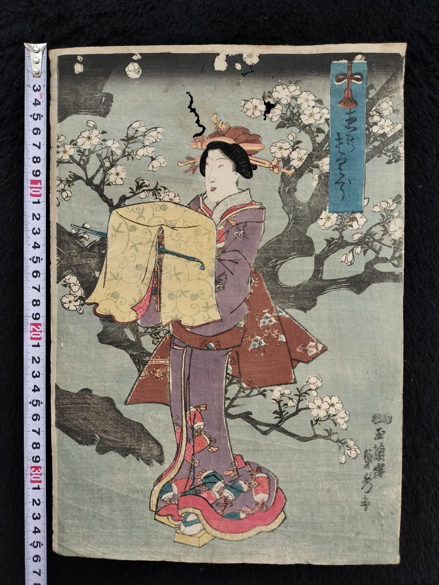 - 江戸期/真作 歌川貞秀「桜 美人」本物浮世絵木版画 美人画 錦絵 大判 裏打ち