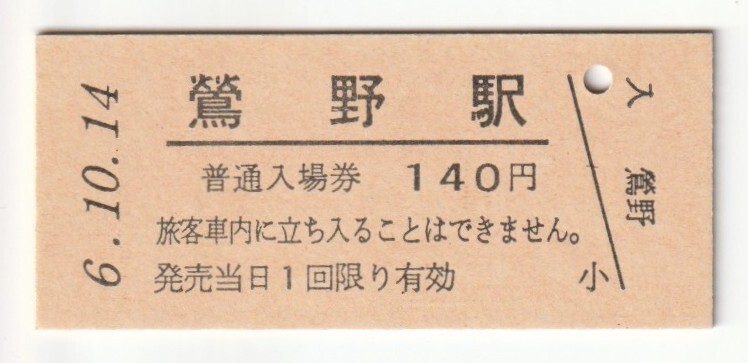 - 平成6年10月14日 田沢湖線 鶯野駅 140円硬券普通入場券(日付印刷)