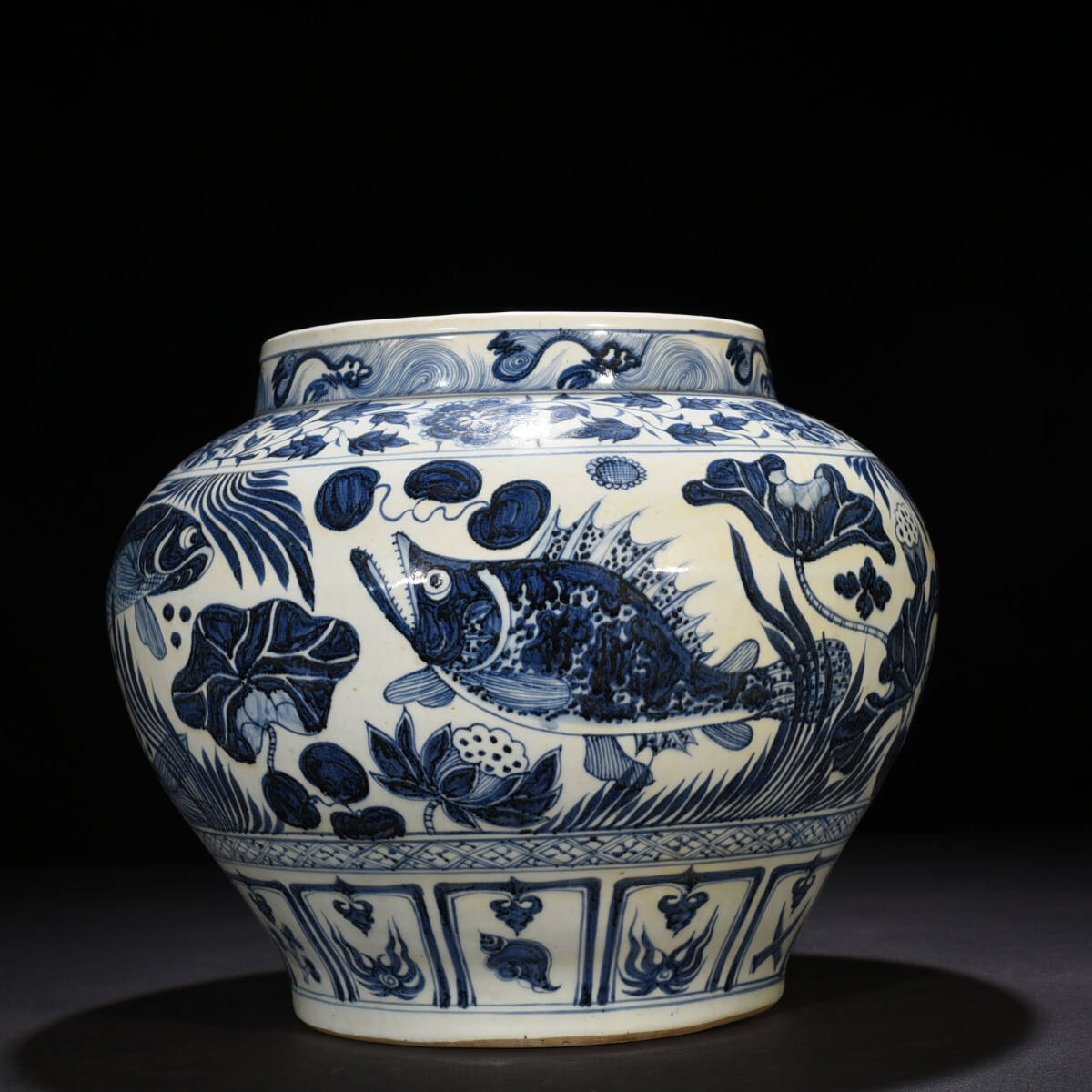- 元時代 青花 水草魚文壺 陶磁器 中国美術 古美術 置物SW0221