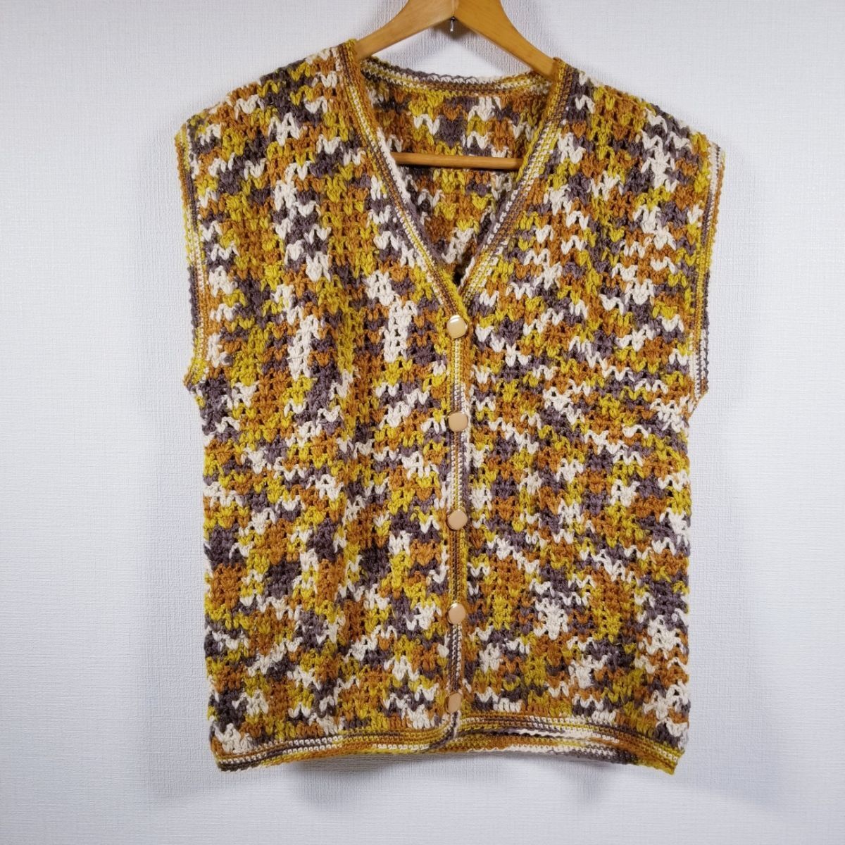 - ハンドメイド 手編み レース編み 前開きニット ベスト レディース ブラウン系