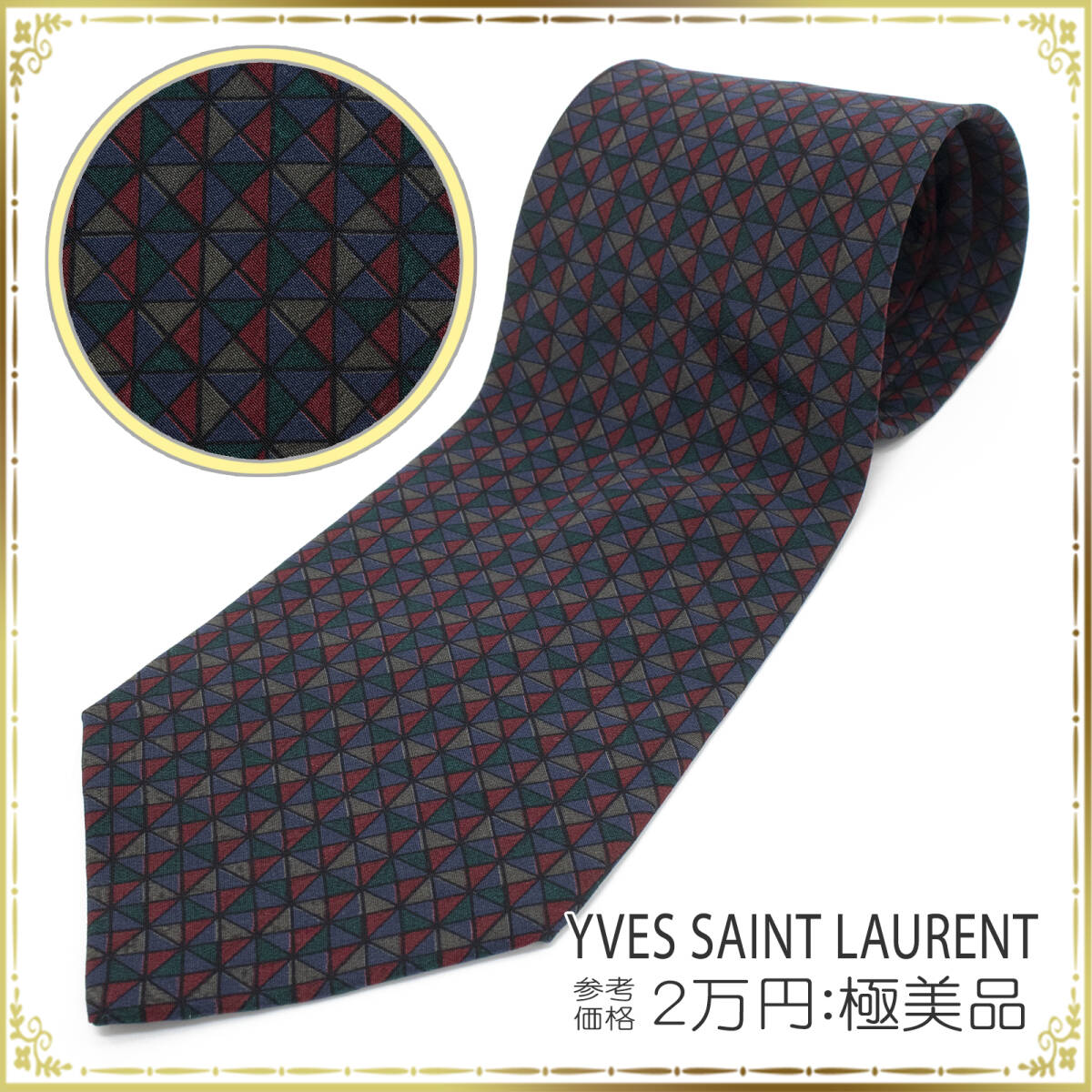 > 【全額返金保証・送料無料・極美品】イヴサンローランのネクタイ・正規品・日本製・ヴィンテージモデル・スクエア・トライアングル総柄