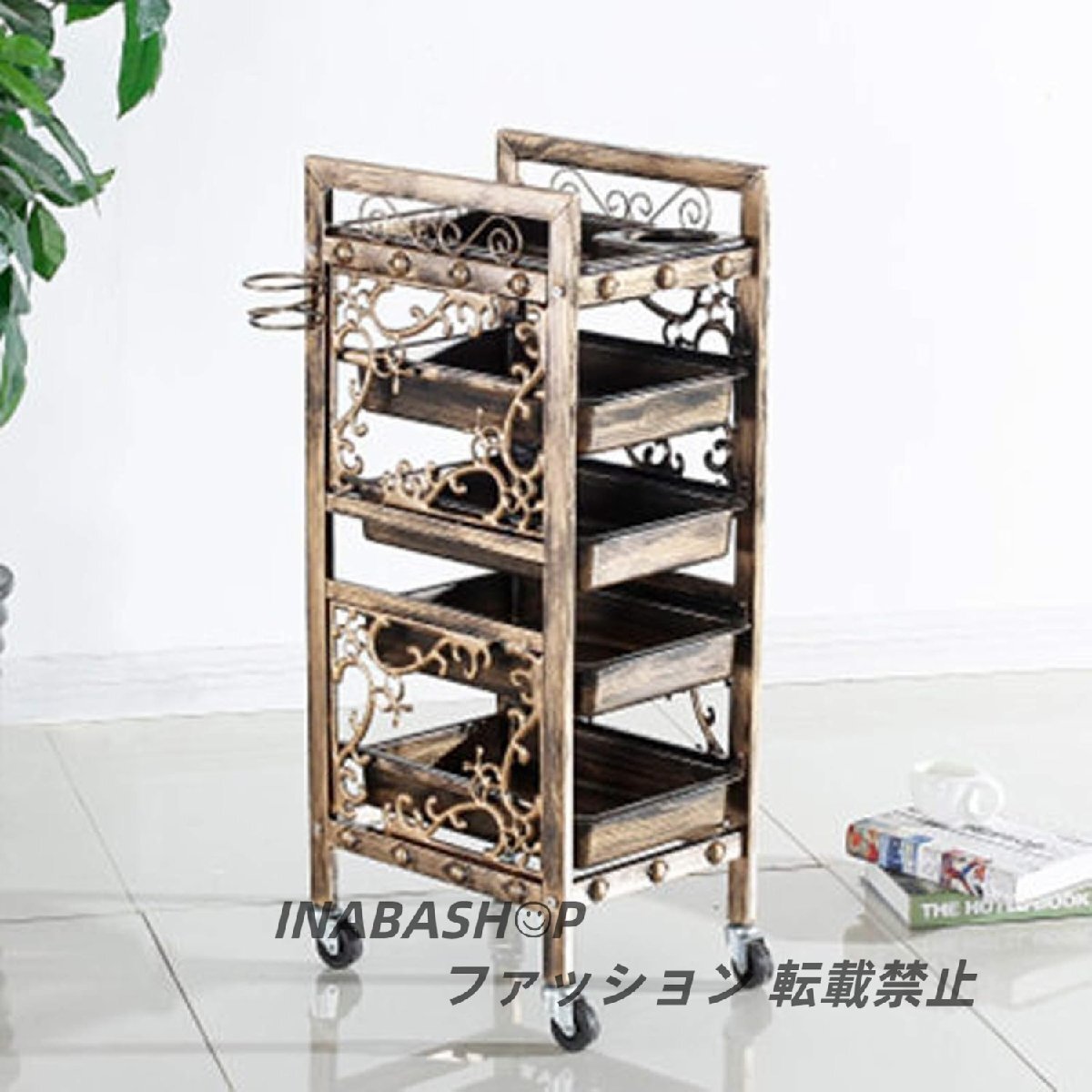 - レトロサロン理髪トロリー、理髪理髪美容収納カート、4つの引き出し式ゴールデン引き出し付きサロントレイ