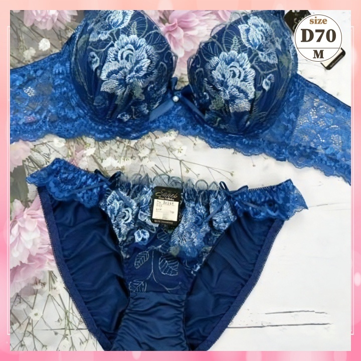 > Za7002◆新品 ブラショーツセット【A70/M】下着 ランジェリー 脇高 谷間メイク 牡丹刺繍 紺