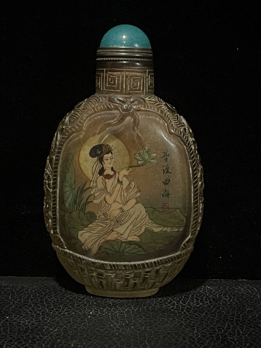 - 蔵友旧蔵出 琉璃製 細密彫 蓮花觀音紋 鼻煙壺 希少珍品 貴重品 置物 古賞物 中国古玩 中国古美術品