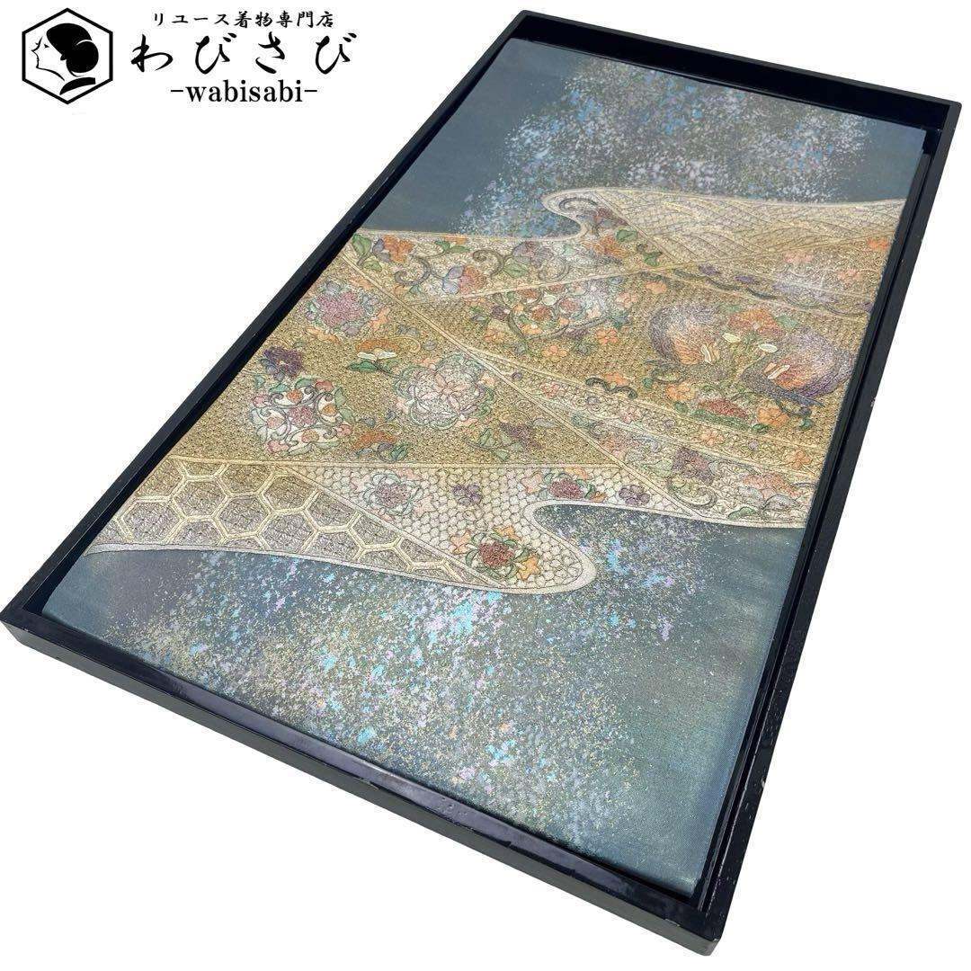 - 袋帯 美しい刺繍に螺鈿の華柄模様 引箔 青銅色 O-4449 着物 きもの kimono 和服 和装 中古 リサイクル着物 【送料無料】