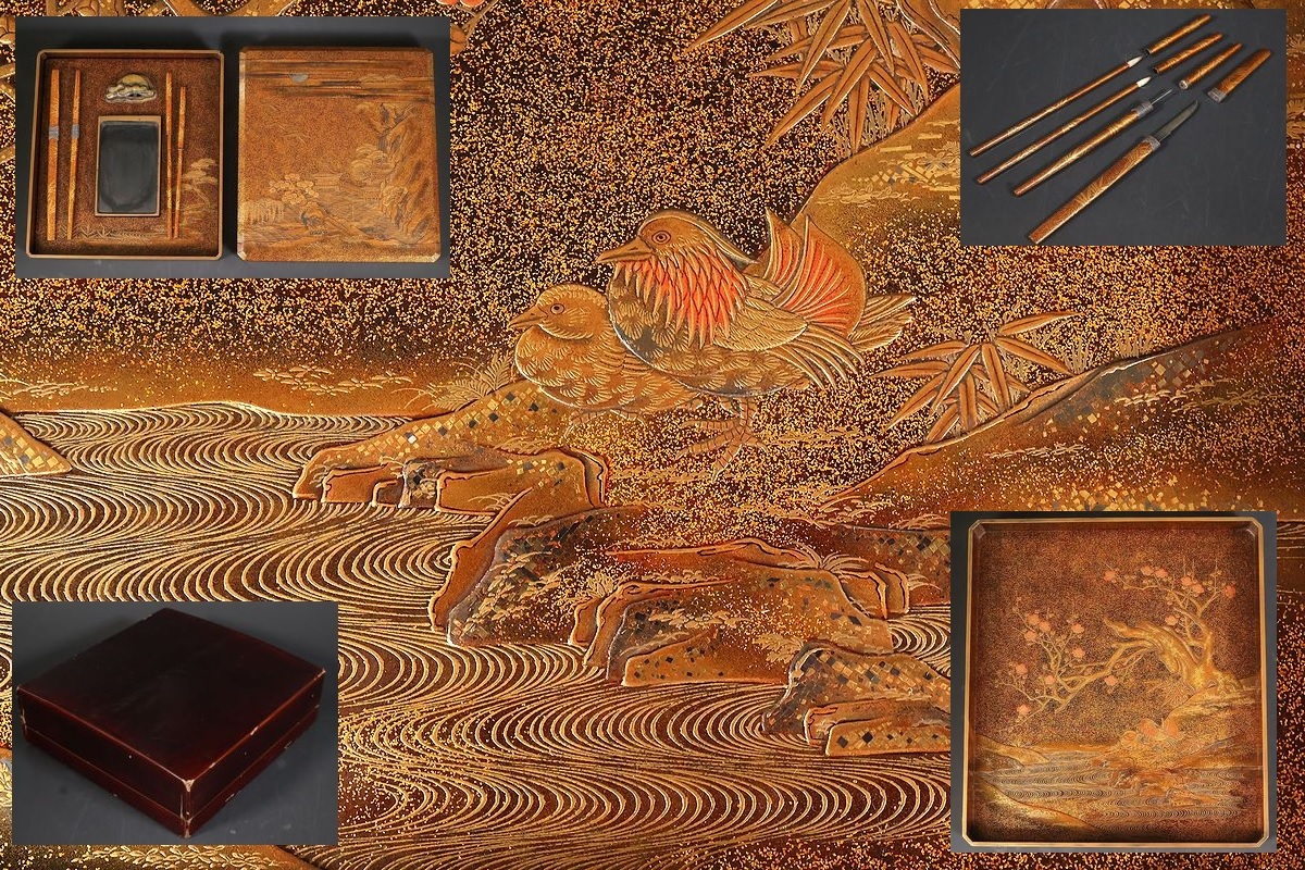 - 【小】5316 江戸期 上質な時代金蒔絵 金梨地月山水蒔絵硯箱 鴛鴦蒔絵 時代箱有 蒔絵筆他小物四点付