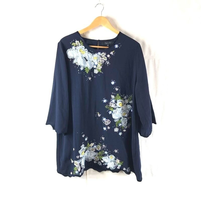 > ナチュラルベーシック NaturalBasic チュニック 花 刺繍 ラインストーン レース スカラップカット ネイビー系 3Lサイズ 2025083000417