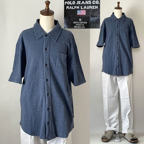> ★【Y2K 00s デザイン&素材◎ 国内正規品】POLO JEANS CO. ポロ ジーンズ コットン100% ポケット 半袖 シャツ S グレー ネイビー系