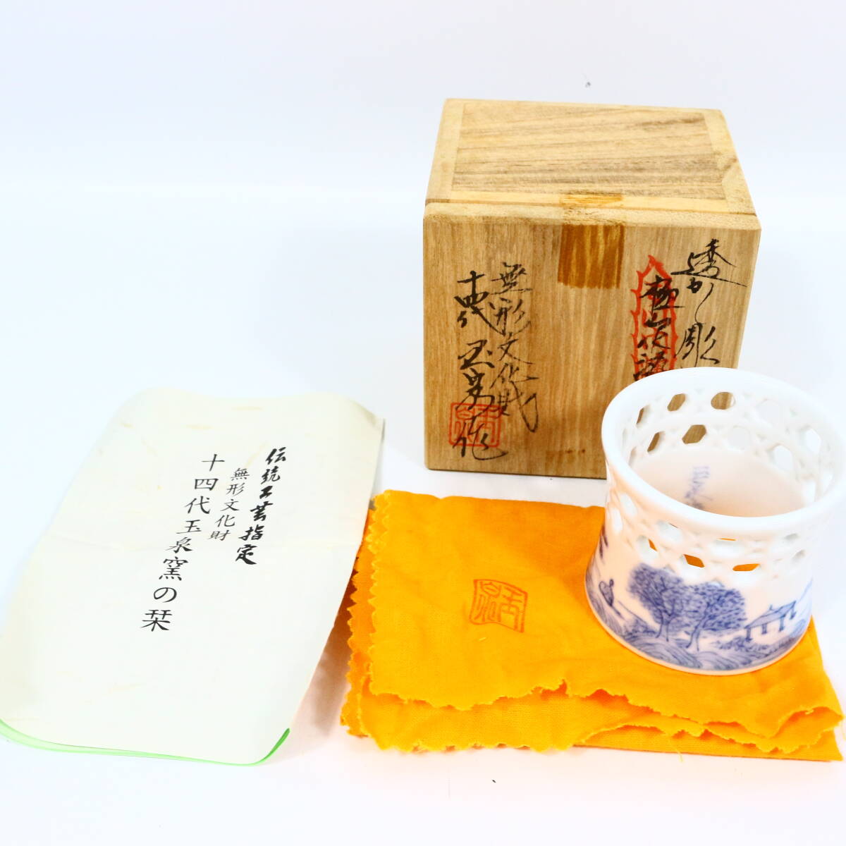 > 無形文化財十四代玉泉窯 透かし彫り 極山水染付 三川内焼 蓋置 共箱 共布 水屋道具 茶道具
