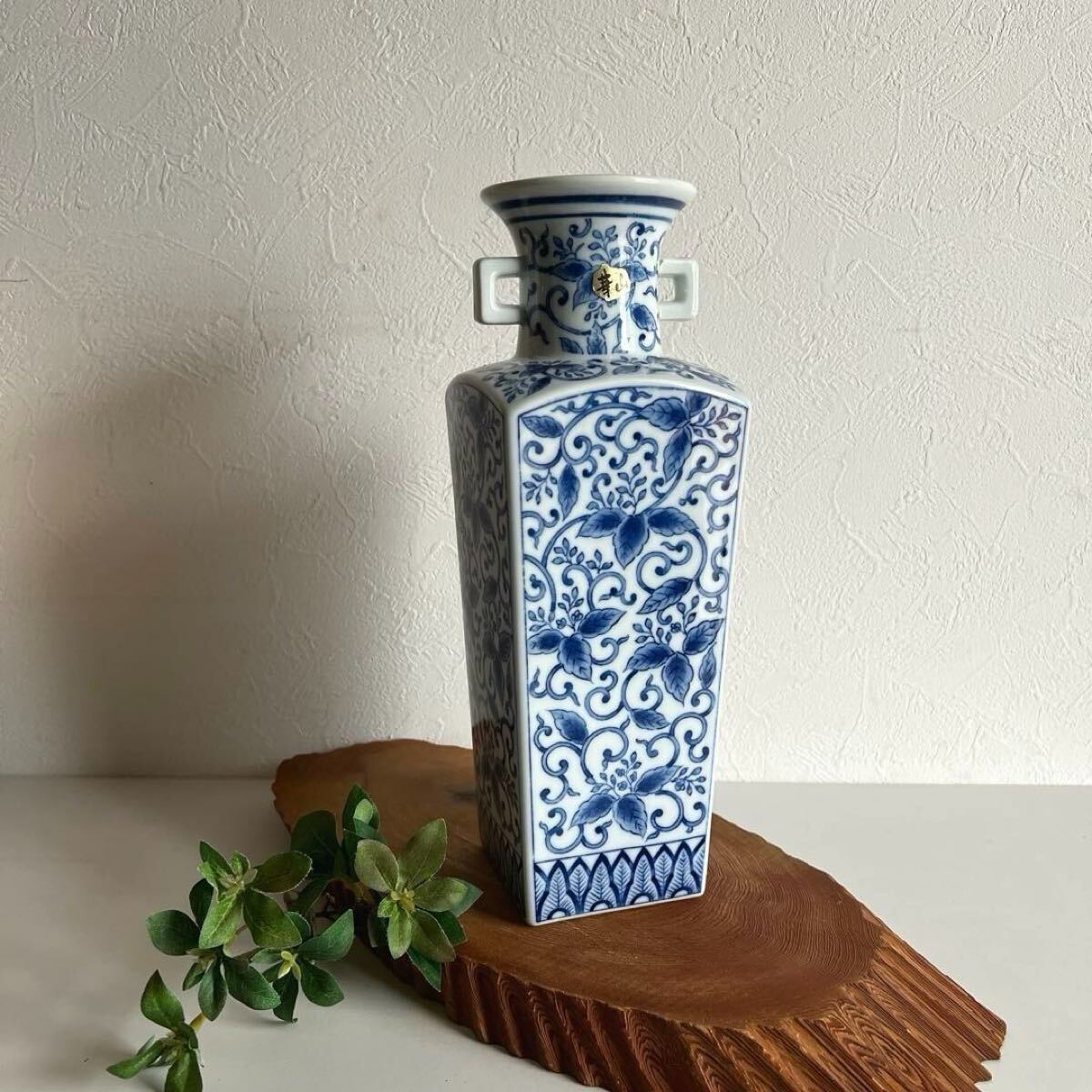 - wasabi k911 有田焼 華山窯 耳付き花瓶 花器・花入れ・フラワーベース 白地に染付で描かれた大陸調の唐草文様がオリエンタルな雰囲気の逸品