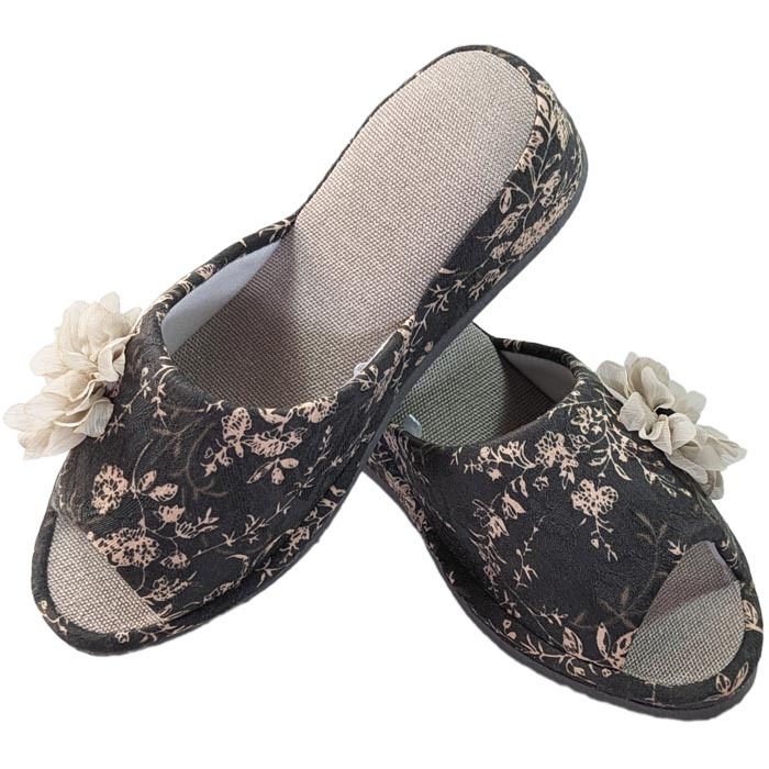 > ヒール スリッパ 花柄 コサージュ ダークグレー ヒール高 4cm ヒールスリッパ ヒールアップ 室内履き レディース 美脚 かわいい おしゃれ