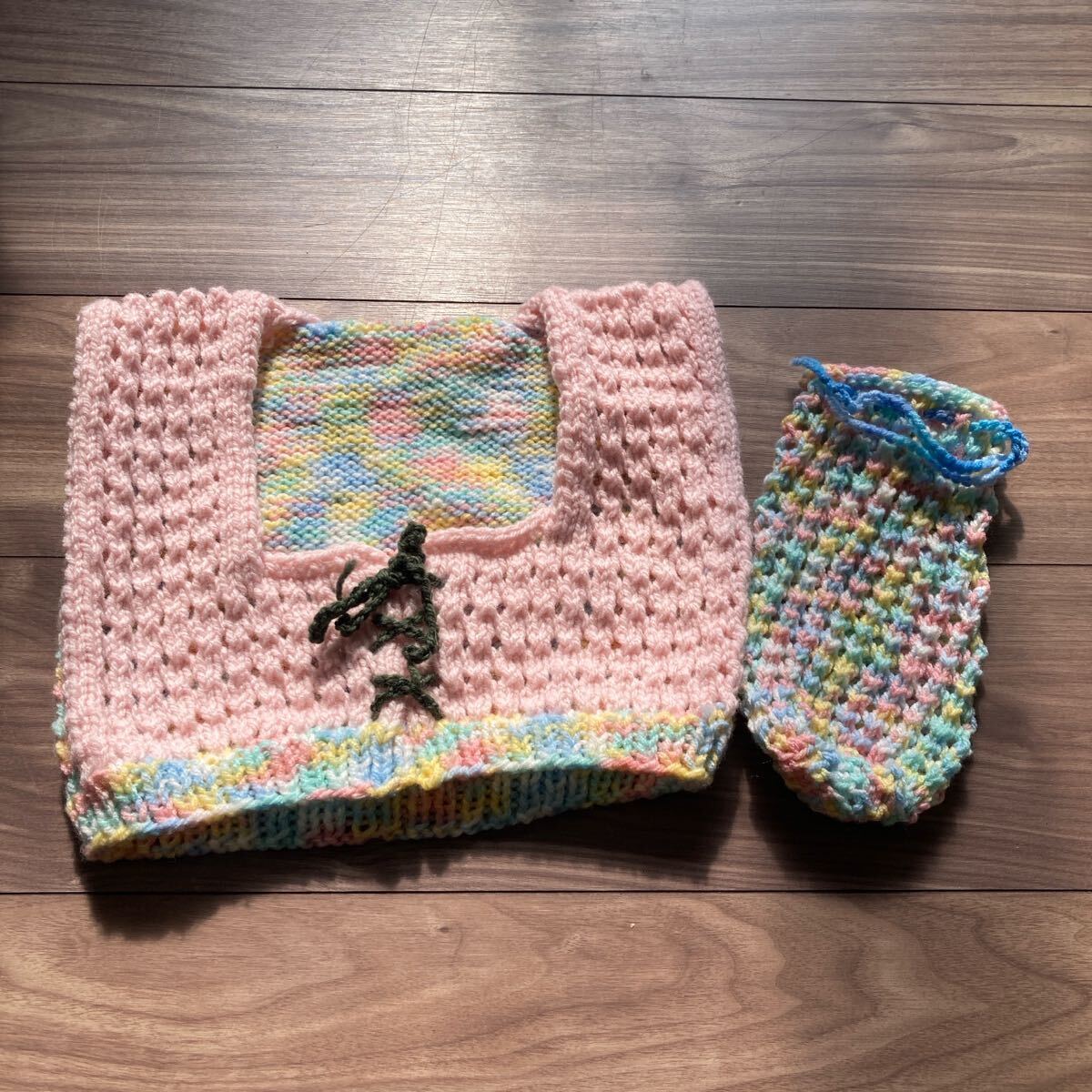 - カラフルな手編みのニットベストと哺乳瓶ケースセット