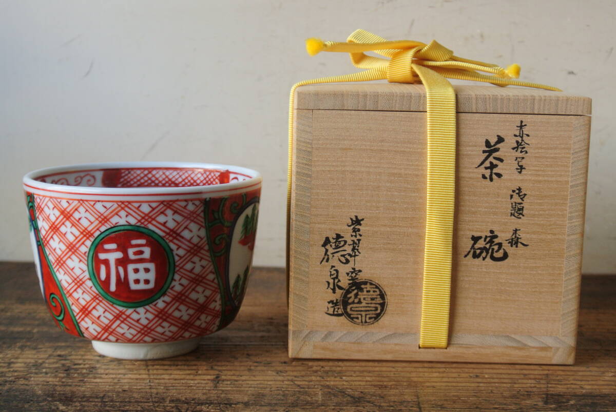 紫翠窯 三代西村徳泉造 赤絵写 御題 森 茶碗 栞 共布 共箱です。