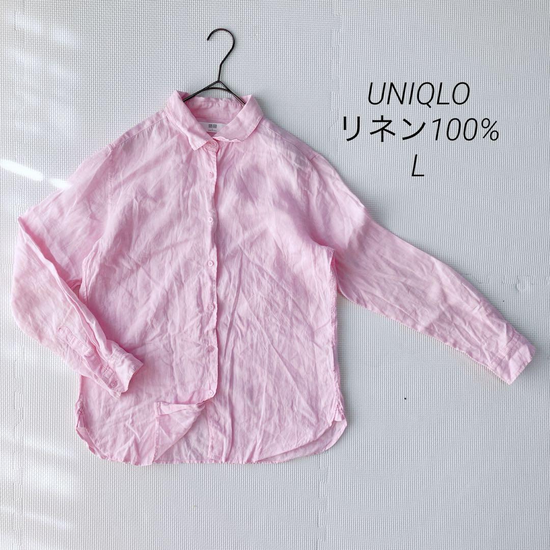 > ユニクロ 麻 リネン100% シャツ L ピンク カジュアル 長袖 UNIQLO