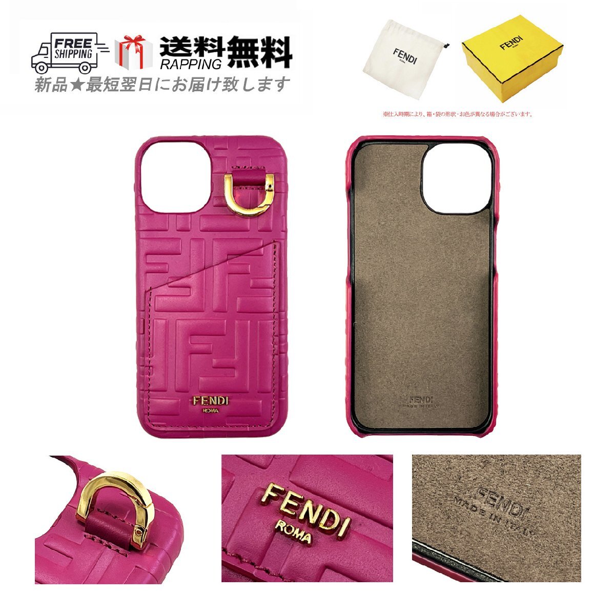 - L666.. FENDI フェンディ iPhone 14 ケース アイフォン スマホ FF レザー ロゴ イタリア製 7AS183APTWF1MQA ★ ピンク
