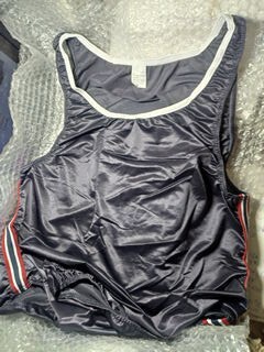 - ノーブランド製品、メンズ、ビキニ、ボディースーツ、ダークグレイフエイクシルク,両脇赤白黒5本線,ナイロン58,3%、フリー(L~XL)サイズ,