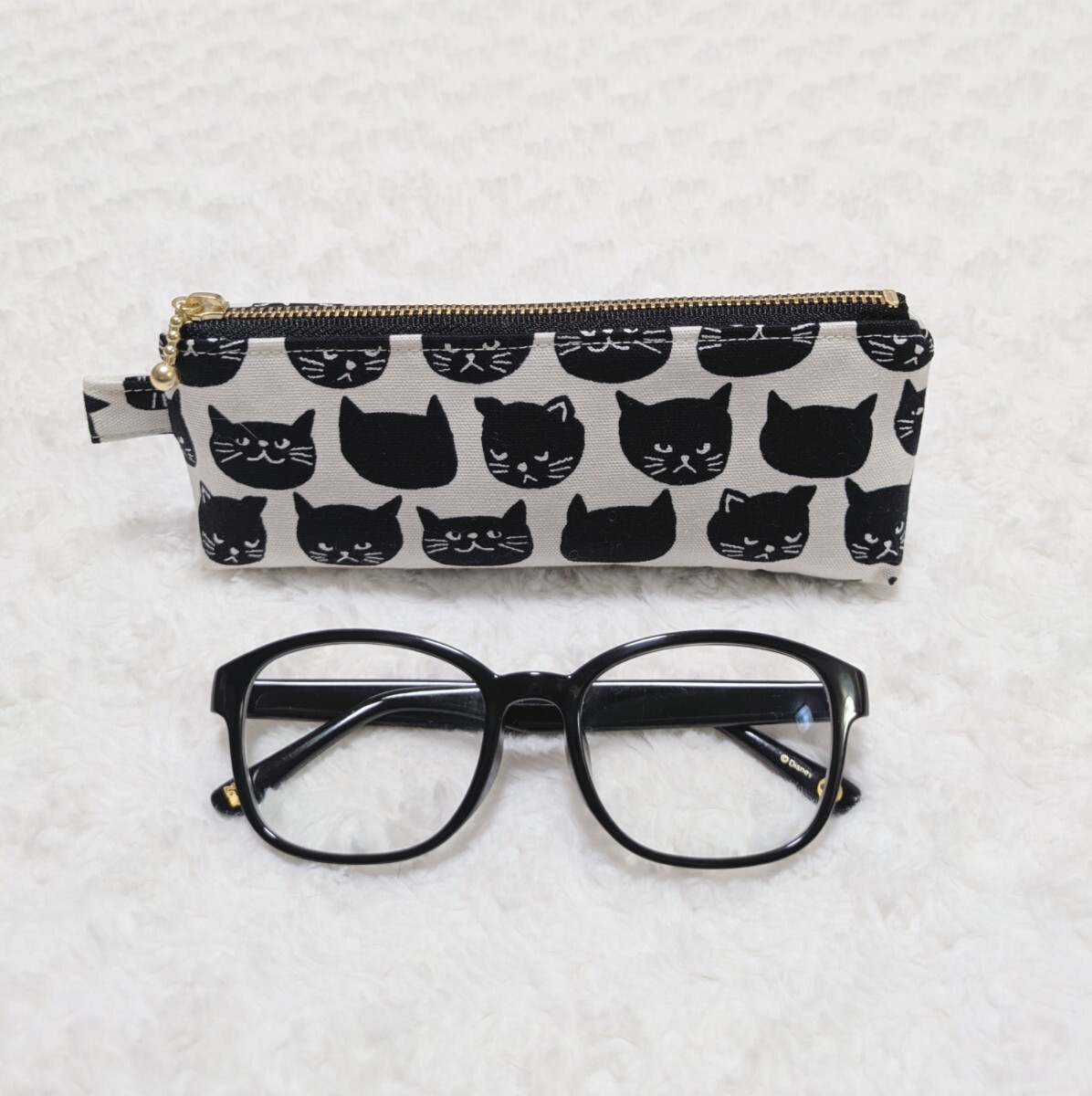 - 大人可愛い ちび黒猫だらけ柄のメガネケース ファスナータイプ 白 ペンケース 再販