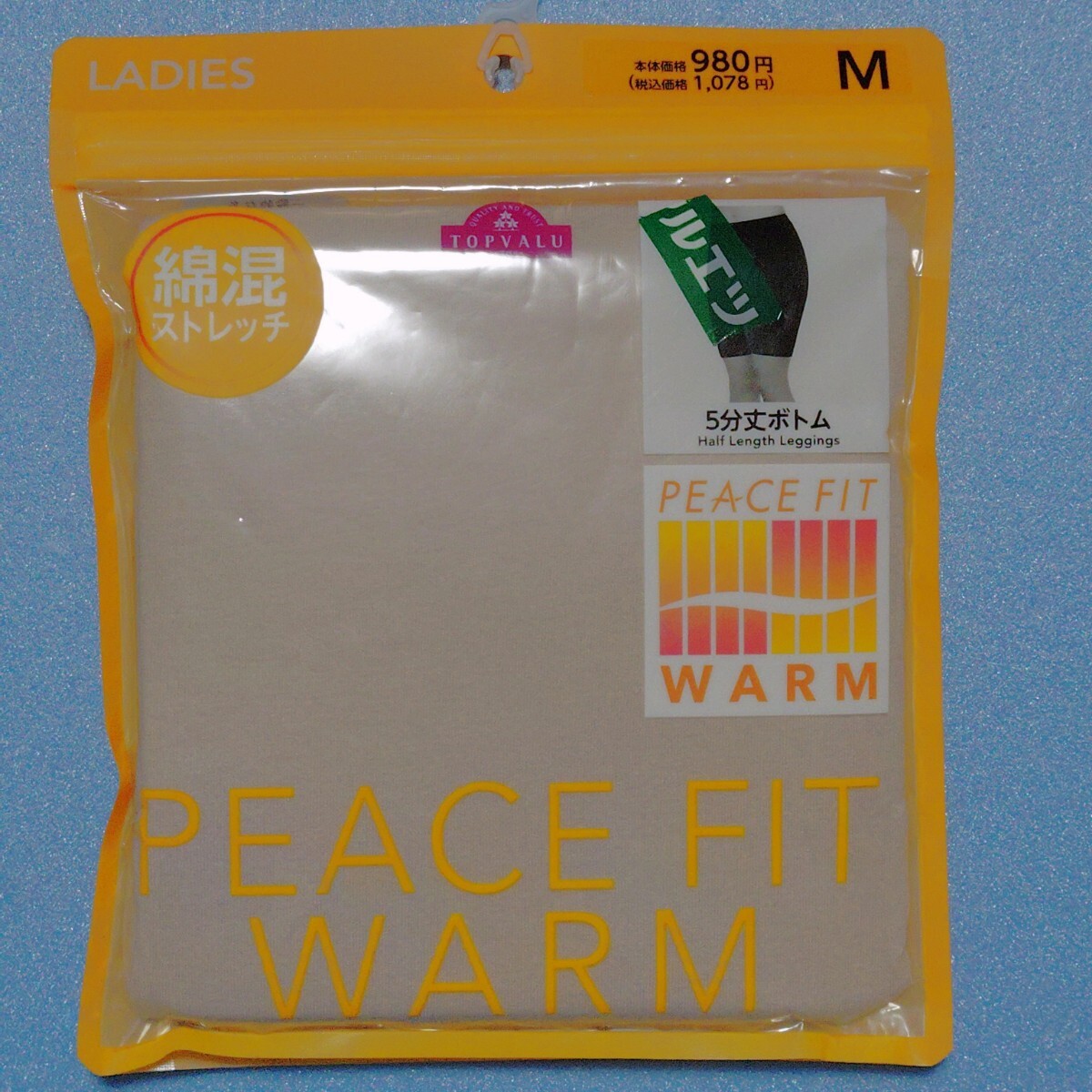 - M 新品 未開封 5部丈 スパッツ ボトム 綿 コットン 95% 暖かい 保湿 イオン トップバリュー 秋 冬 春 ベージュ 白いパンツ 透けない