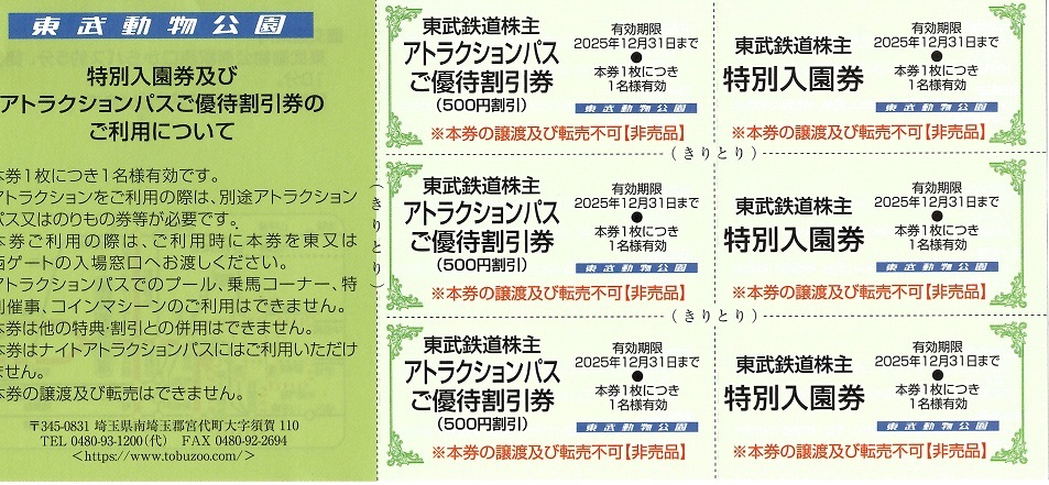 - 東武鉄道 株主優待券 東武動物公園 特別入園券+アトラクションパス割引券 3枚セット 2025年12月31日迄 1~2組有