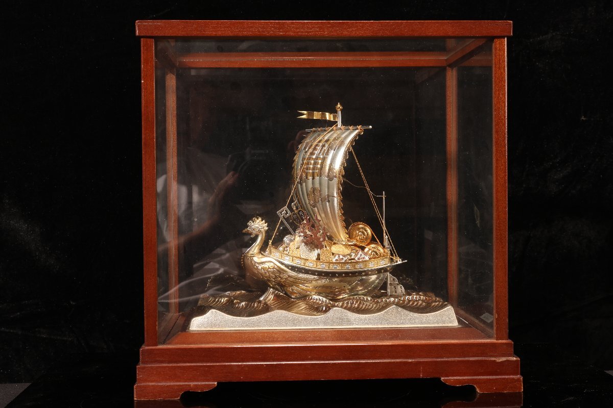 - 【珍品堂】1円から W13-V30 武比古作 銀製 刻印有 伝統工芸 宝船 置物 縁起物 商売繁盛 ショーケース付 古美術 骨董品 重1652g 高26cm