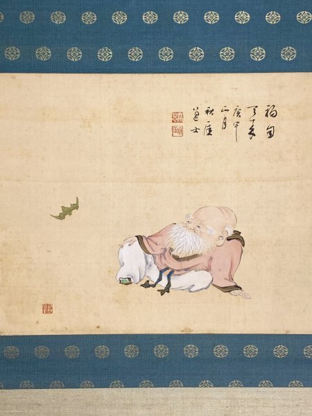 > 《魚亀》【模写】後藤秋厓「布袋蝙蝠図」絹本 田近竹邨師事 南画家 こうもり 日本画 中国 茶掛 茶道具 掛軸 掛け軸 人が書いたもの