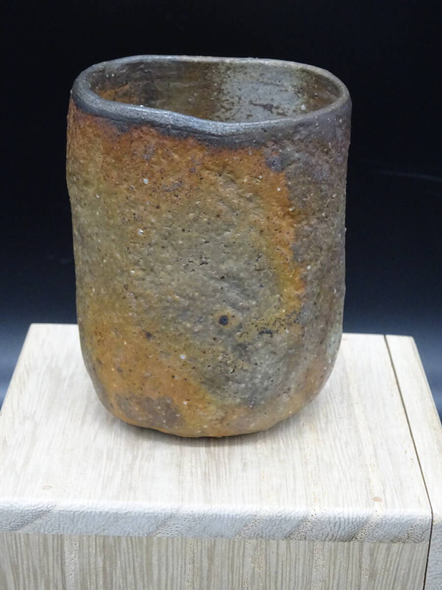 - 備前焼 人気実力作家 久郷剛司(備前焼窯元六姓金重家金重利右衛門)★備前窯変刳り貫き冷酒杯 共箱、共布、陶歴付 茶道具