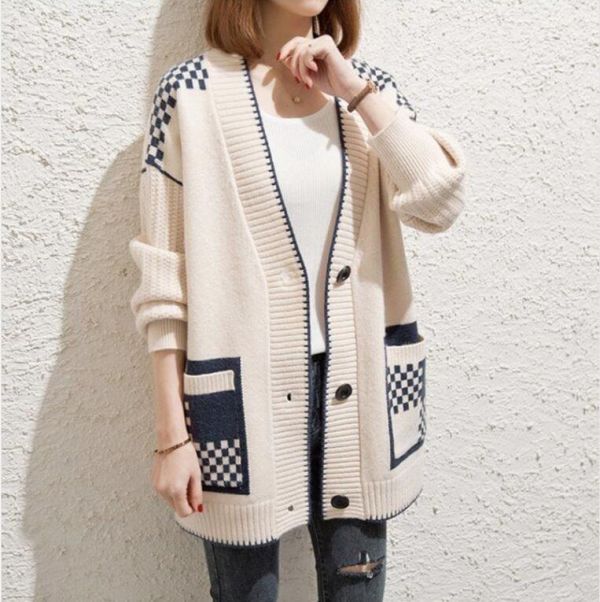 - 新入荷*秋冬 レディース ドルマン 厚手 ニットカーディガン 配色柄 長袖 セーター 体型カバー ロング 羽織り アウター 編み上げ *ベージュ