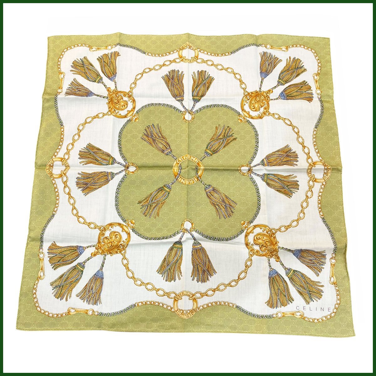 - 中古美品● CELINE /セリーヌ ●デザイン スカーフ 大判ハンカチーフ タッセルチェーン柄 グリーン系 約50cm