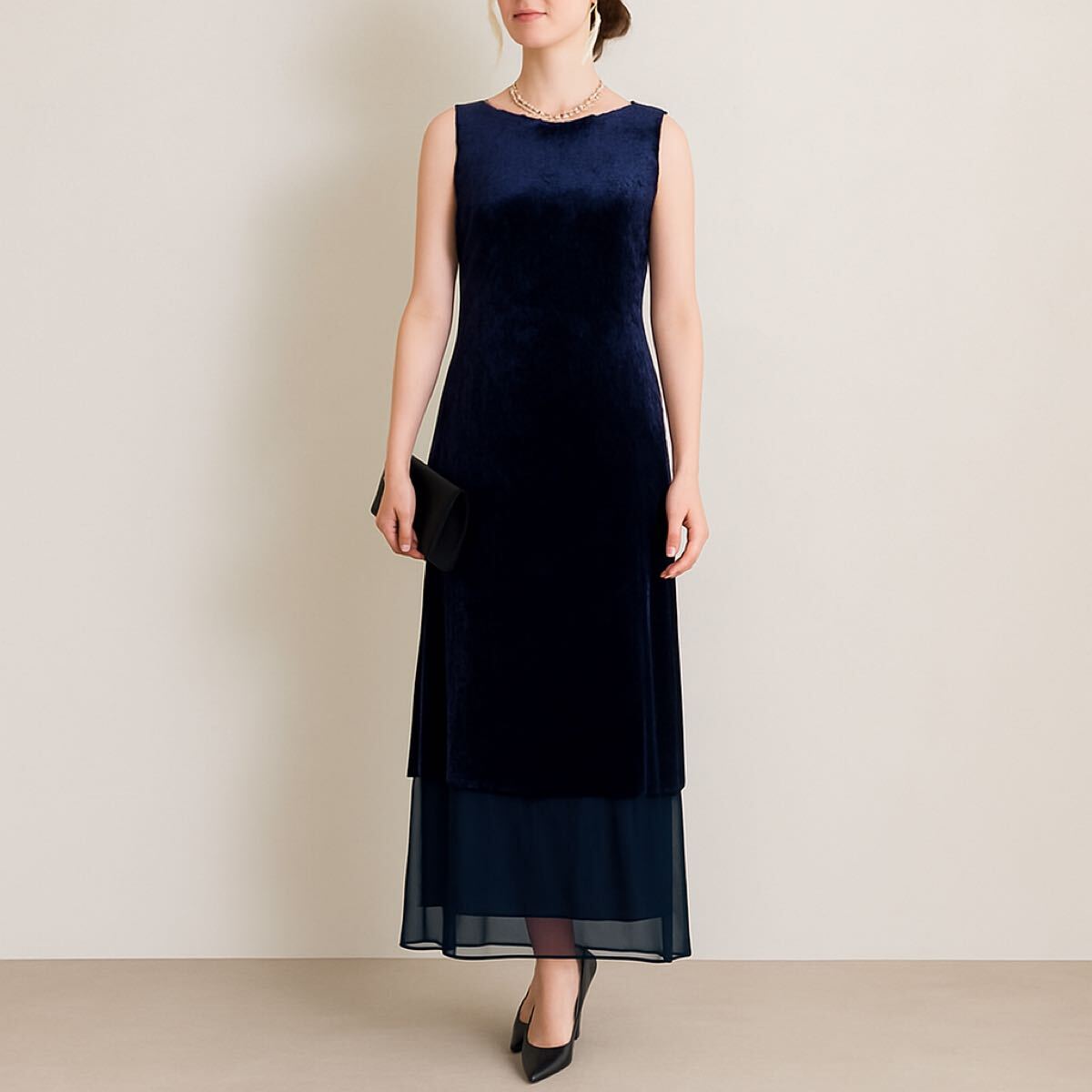 - MICHEL KLEIN ミッシェルクラン ベロア×シフォン切替 ロングワンピース M相当 スリット入り