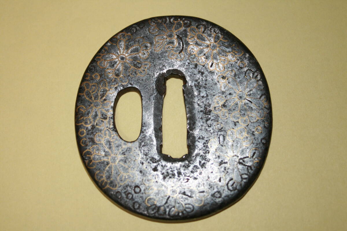 > ▽美▽ ★ 優品 ★ 平安城式真鍮象嵌鍔 鉄地 丸形 無銘 (カ)☆ 時代物 室町 刀 脇差 鍔 はばき 同田貫【売切れ御免 / 遺品整理 】