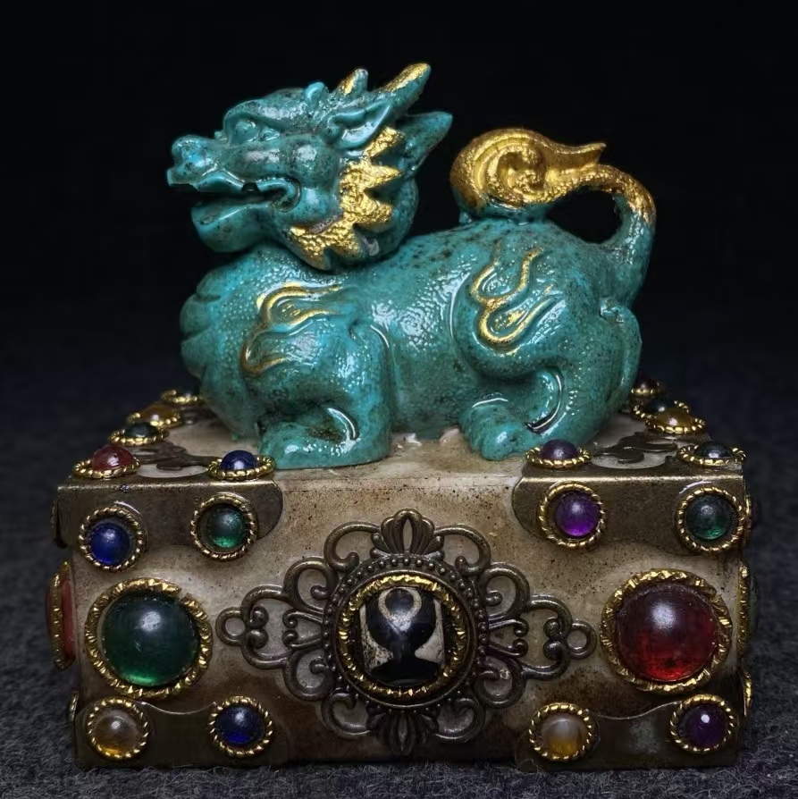 - 清時代 宮廷御用 寶盒珍藏 綠松石嵌寶石 麒麟印章 印鑑 手彫り 箱有 極細工 古置物 古美術 古賞物 古董品 時代物 旧家蔵出 中国唐物928