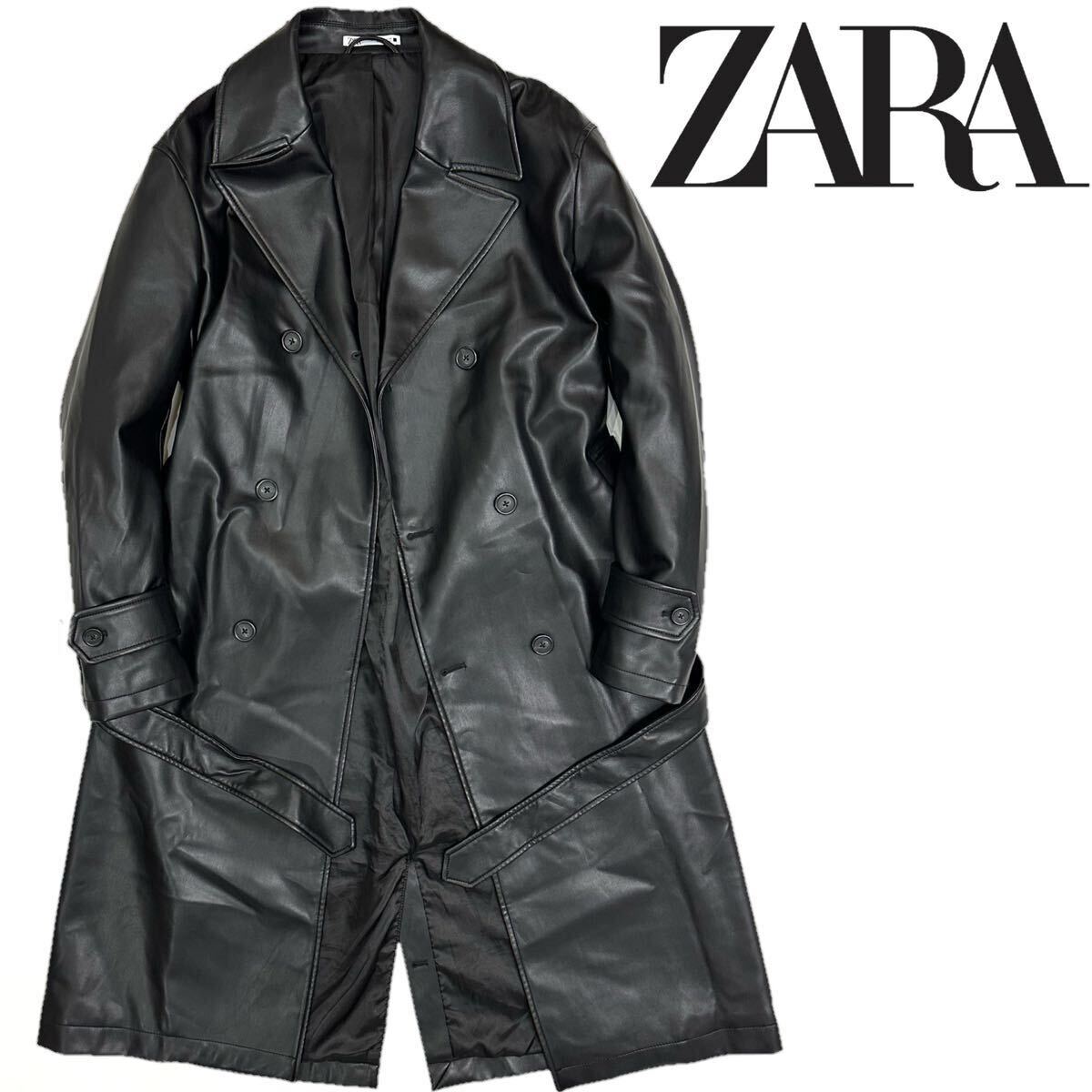 - 良品!!ZARA ザラ フェイク レザー ロング トレンチコート丈120㎝(L)ブラック 黒 メンズ アウター コート