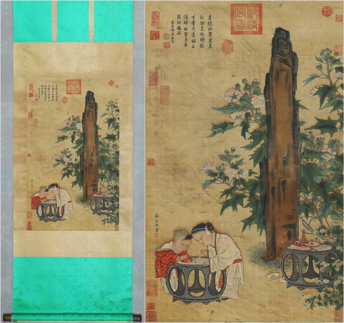 - 古美術 掛け軸 中国・宋時代 「蘇漢臣書」 絹本 【庭院秋声図】 立軸 書道 巻き物 肉筆保証 唐物 古画 画心85x53cm LT-2509150