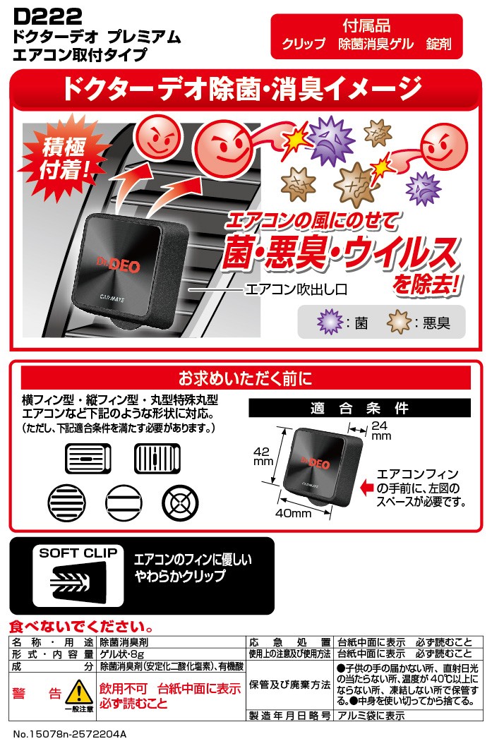 - 送料無料!(沖縄・離島不可) カーメイト 自動車用除菌消臭剤 ドクターデオプレミアムエアコン取付タイプ ブラックメッキ 無香【D222】