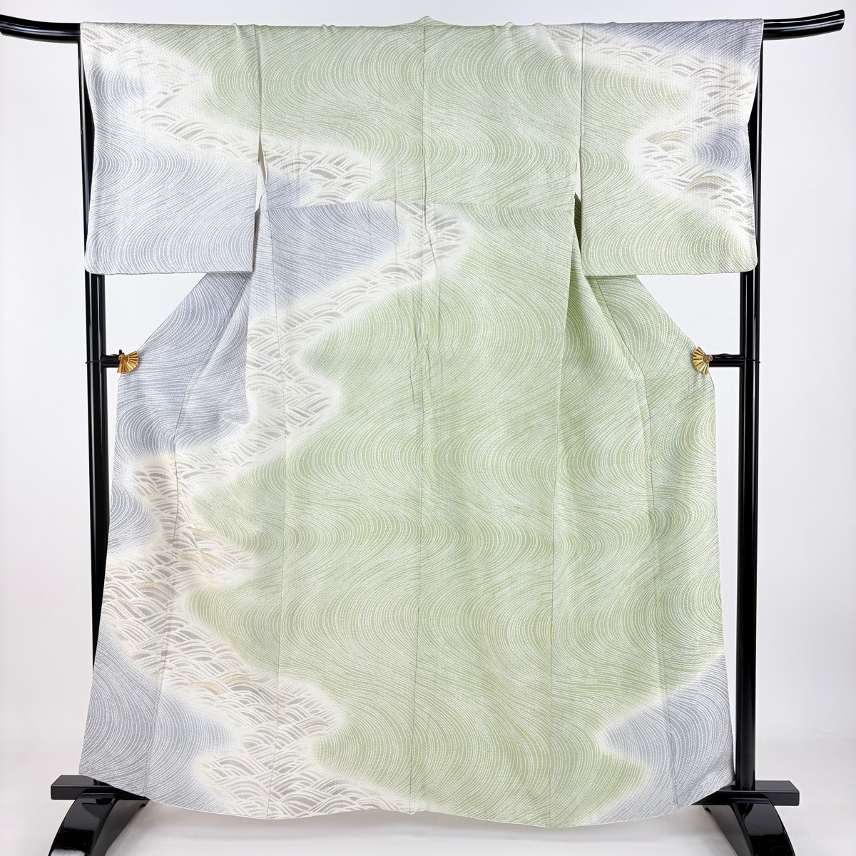 - 訪問着 身丈161.5cm 裄丈67.5cm L 袷 波 金彩 青灰色 正絹 名品 【中古】