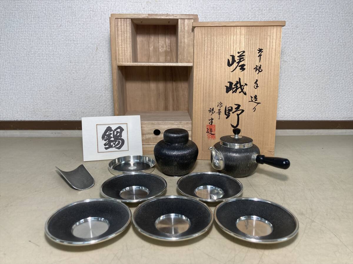 - 京都10☆ 茶器 浪華錫半造 嵯峨野 茶器揃 錫製 急須 茶托 茶合 茶壷 瓶座 煎茶道具 栞 共箱付 現状品