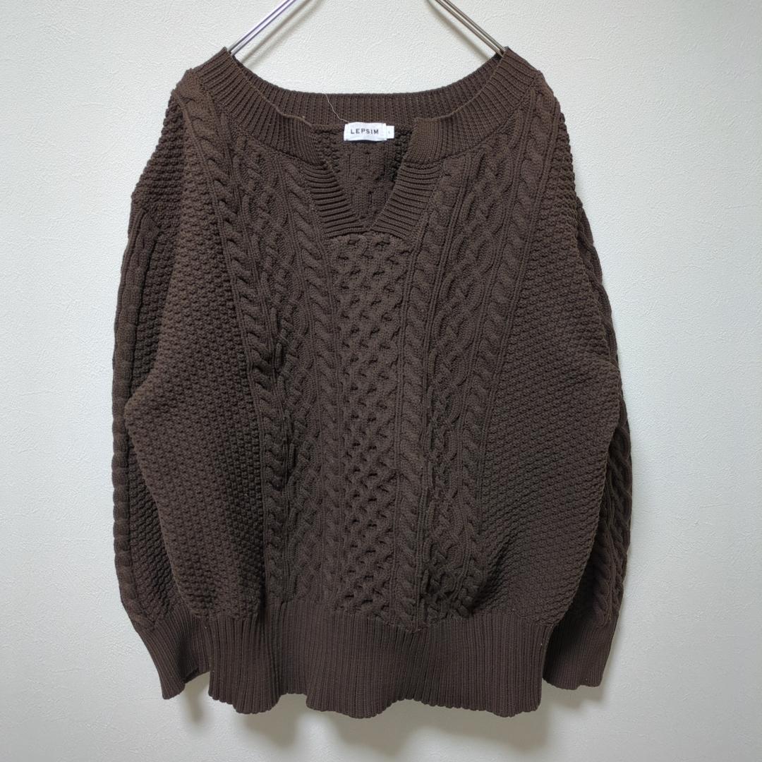 - レプシィム(L)ケーブル編みニット*セーター*長袖*キーネック*プルオーバー*茶