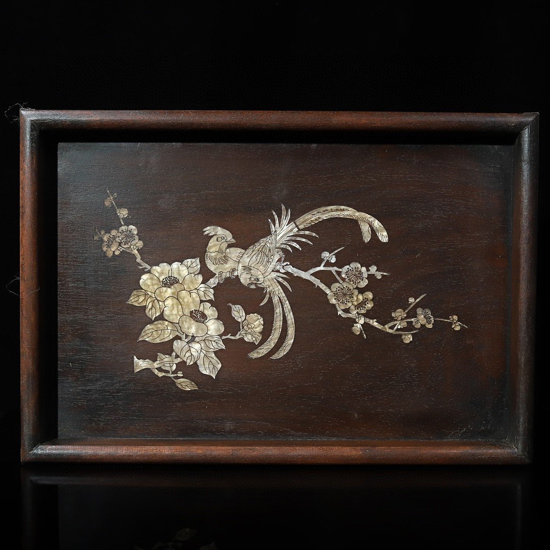 - 送料無料! 花梨木 花梨木象嵌貝殼 珍材木彫 茶皿 民具 浮雕嵌貝殼 花鳥茶盤 置物 擺件 中国美術 装飾 賞物 収蔵コレクションsux261