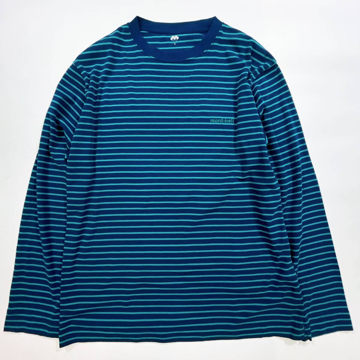> mont-bell モンベル 長袖 Tシャツ メンズ ロンT L ネイビー×グリーン ボーダー ロゴ刺 紳士 収縮性 ポリエステル素材 ☆669