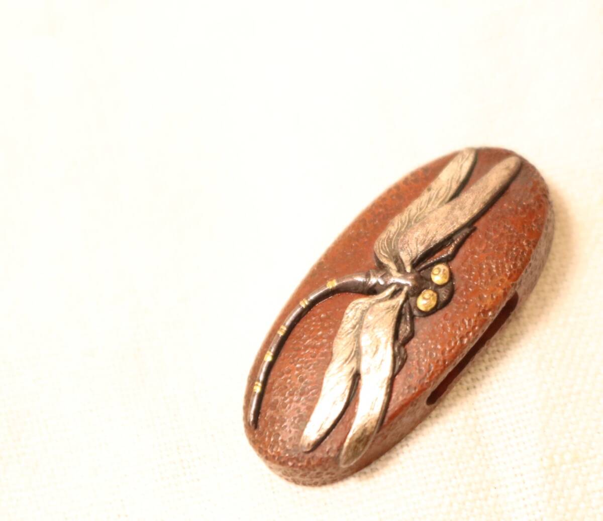 - 刀剣頭金具~素銅、石目地に金銀彩入、蜻蛉小景図~縁頭 刀装具