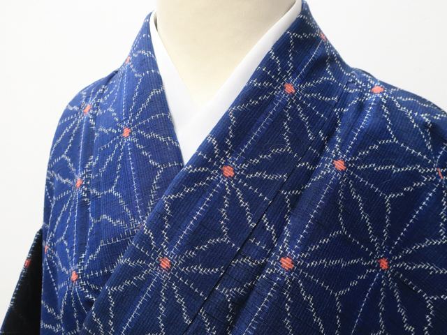 > 《京都一輝堂》【着物】民芸紬 麻の葉文 身丈約160cm 裄丈約63.5cm 24z-4842