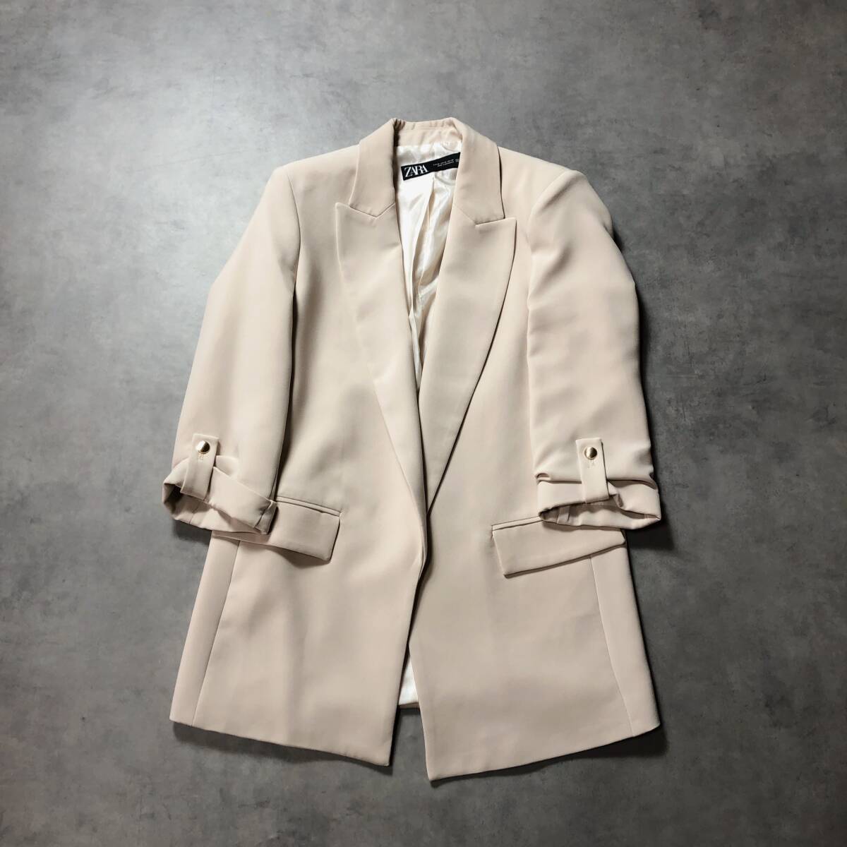 - WQ747●ZARA:ロールアップ 七分袖 テーラードジャケット ボタンレス ●XS● ベージュ ザラ
