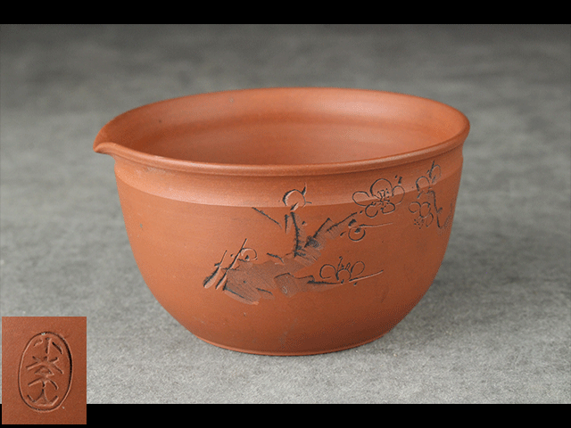 - 【西】H127 煎茶道具 名工 山田常山 造(小常山) 朱泥 梅彫 湯冷