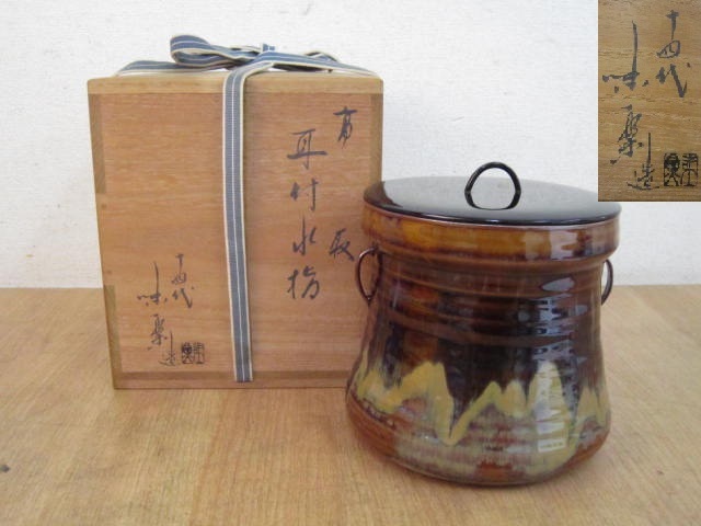 - 【茶道具】十四代亀井味楽造 高取 耳付水指 木箱付き 真作保証