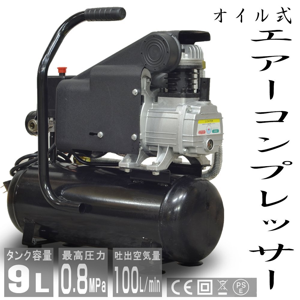 - エアーコンプレッサー 100V オイル式 過圧力自動停止機能 エアーツール 工具 容量 9L 0.8Mpa 小型 車