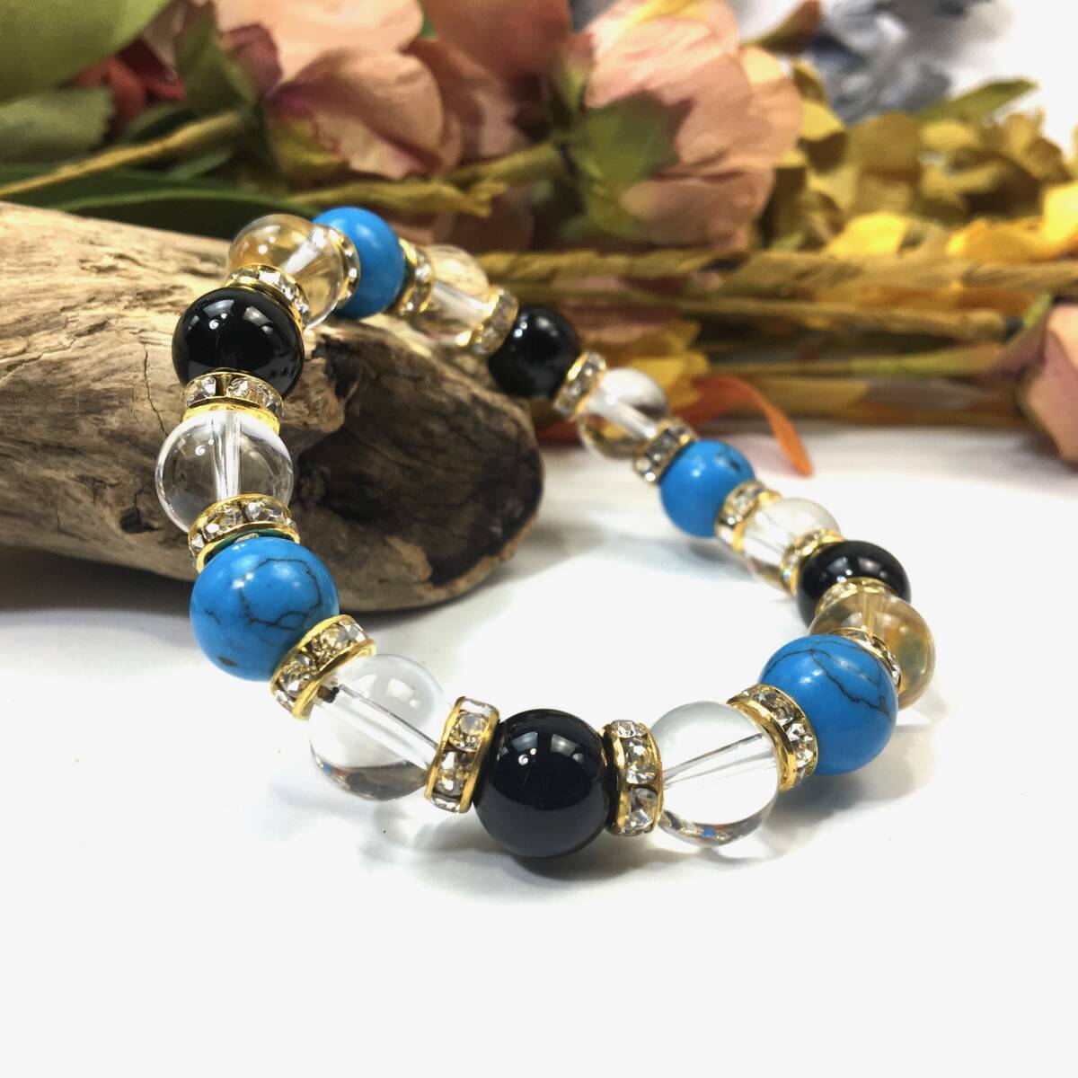 - ターコイズ×水晶×オニキス パワーストーン ブレスレット (ロンデル: ゴールド) 10mm メンズ・レディース
