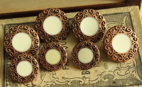 - 即決 ボタン 7個 φ18 & 14mm ブロンズ プラスチック 樹脂 ヴィンテージ 素材 フランス輸入