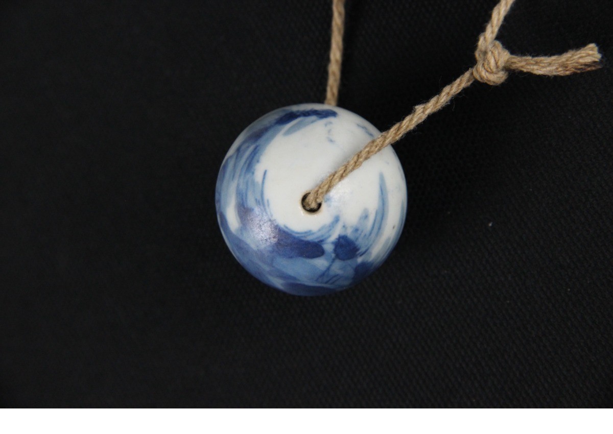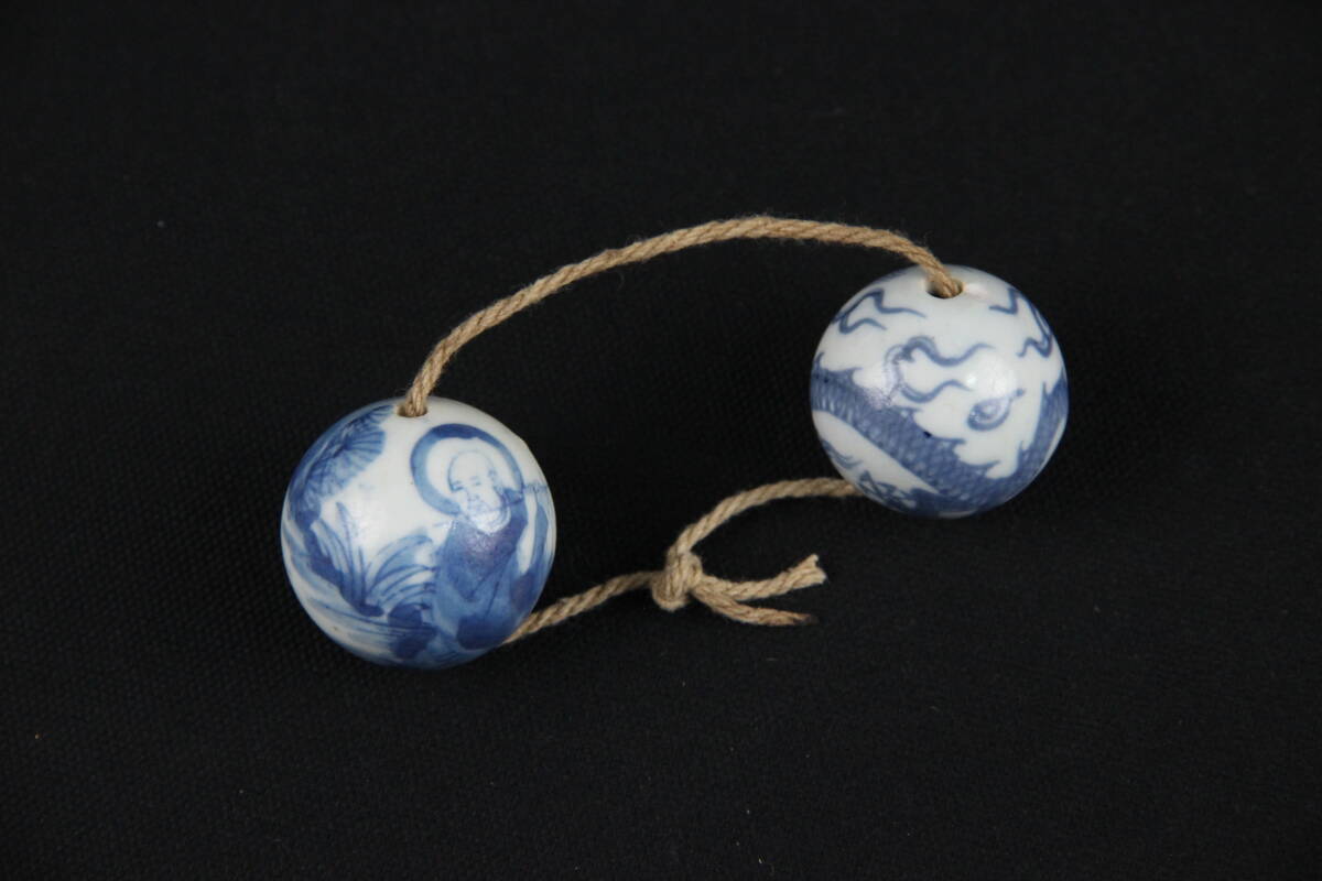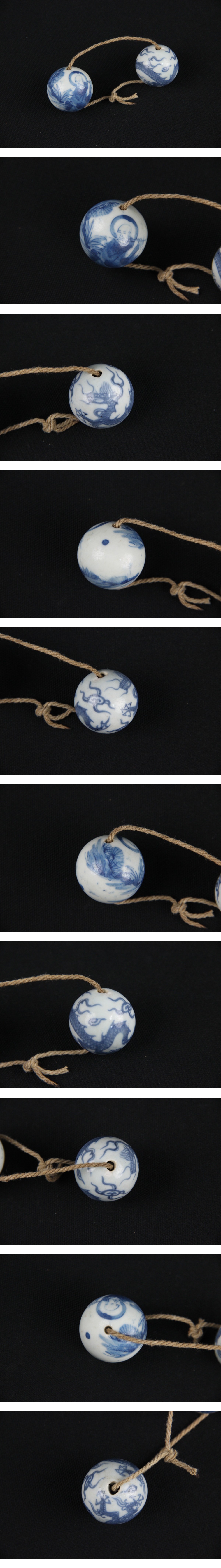 - 中国美術 青花仏人物龍文 球 珠 根付 一対 清時代 景徳鎮 古陶磁器 ES19-13