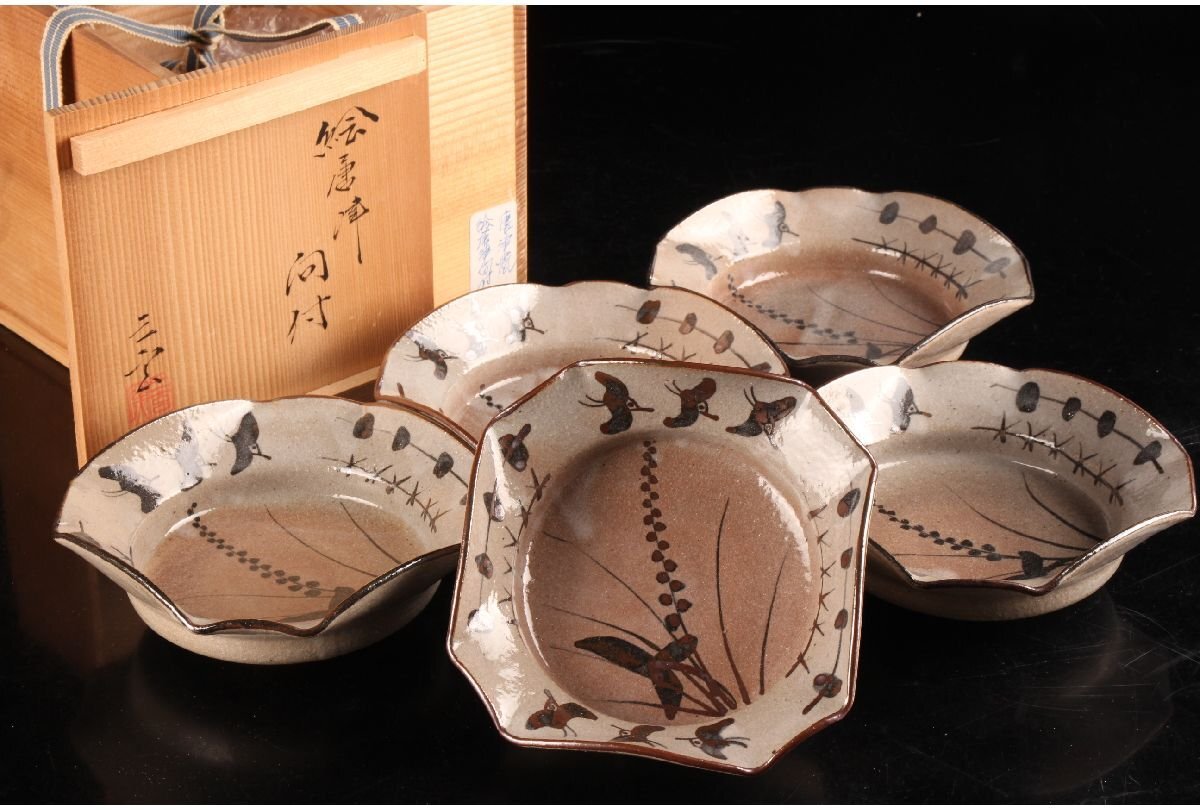 - [URA]三玄窯/絵唐津向付5客/共箱/4-10-14 (検索)骨董/唐津焼/向付/小鉢/小皿/銘々皿/懐石道具/懐石料理